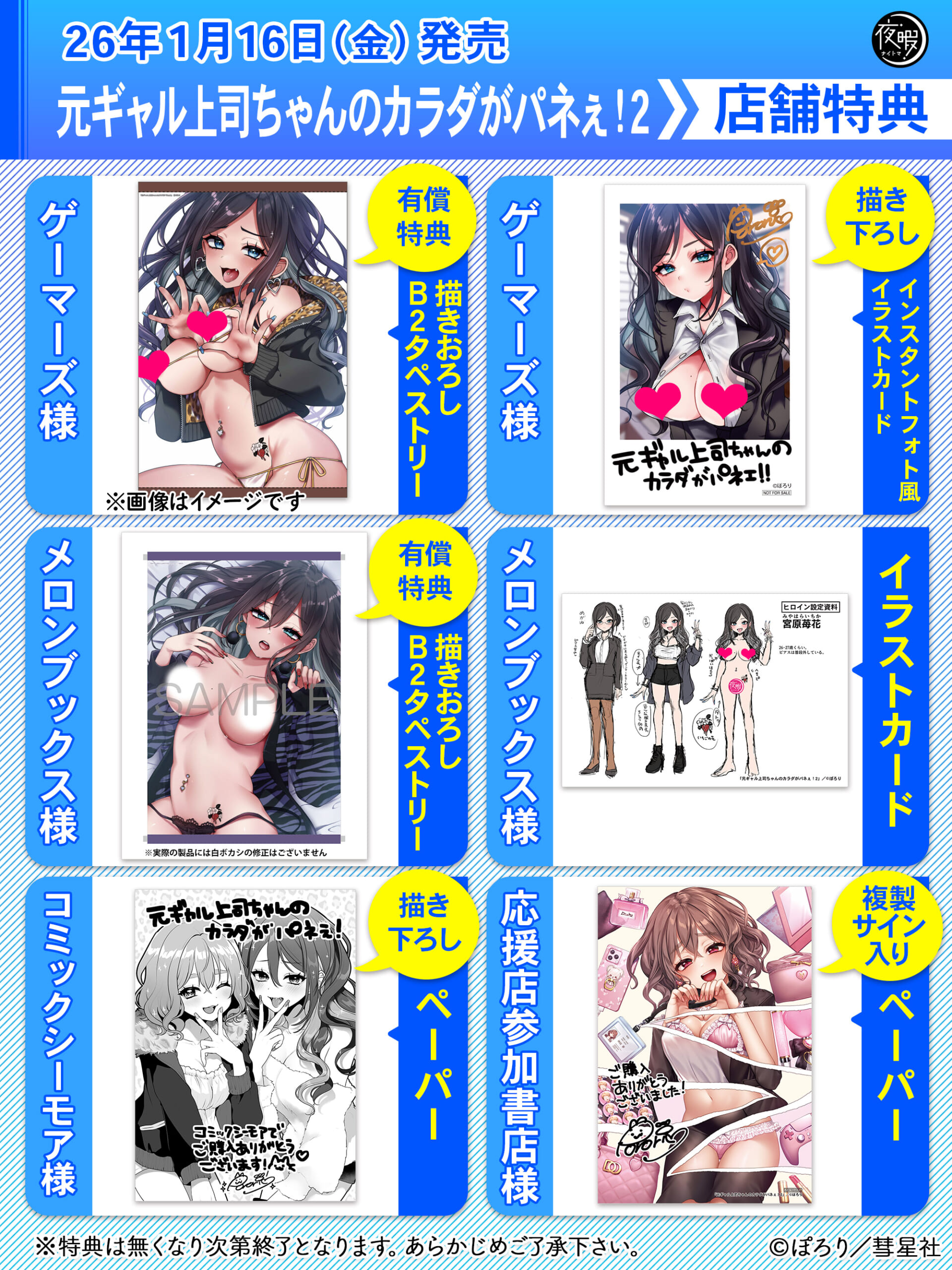▼ゲーマーズ限定描き下ろしインスタントフォト風イラストカード▼メロンブックス限定イラストカード▼コミックシーモア限定描き下ろしペーパー▼応援店限定特典複製サイン入りペーパー≫こちらの応援店にて配布