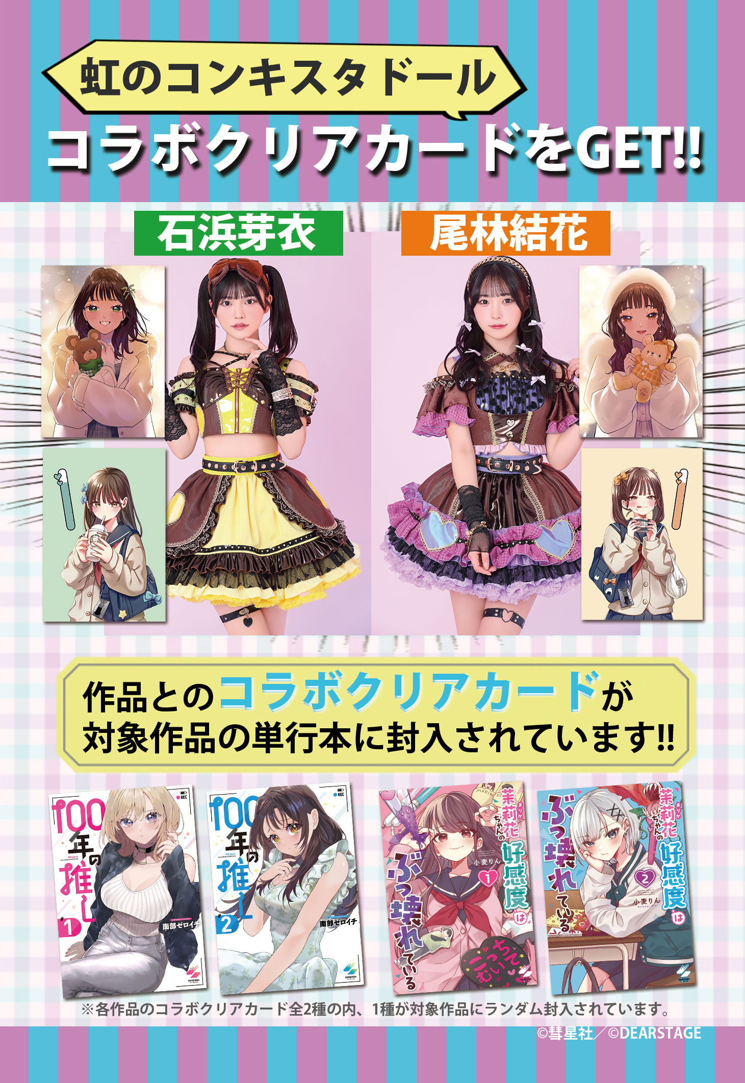 2026年4月17日に1巻と2巻の同時発売が決定している「100年の推し」の南部ゼロイチ先生と「茉莉花ちゃんの好感度はぶっ壊れている」の小麦りん先生が、「虹のコンキスタドール」のメンバー「石浜芽衣さん」と「尾林結花さん」を各作品の世界観に合わせてをコラボイラストとして描き下ろしました。
