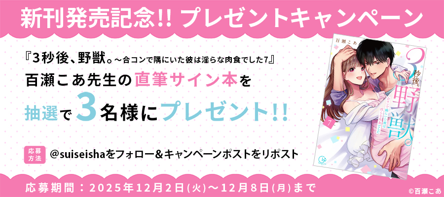 ▼応募期間2025年12月2日(火)~12月8日(月)23:59まで ▼応募方法期間中に彗星社の公式X(旧Twitter)のアカウントのフォローと対象ポストのリポストをそれぞれ行ってください。 ▼プレゼント内容抽選で3名様に、百瀬こあ先生の直筆サイン入り「3秒後、野獣。~合コンで隅にいた彼は淫らな肉食でした7」単行本 ▼注意事項・キャンペーンは予告なく変更、中止することがあります。あらかじめご了承ください。・X(旧Twitter)の操作方法などに関するご質問にはお答えしかねます。ご了承ください。・当選者には当アカウントからDMにておしらせしますので、DMの解放をお願いします。・当選者へのご連絡が終わるまで、当アカウントへのフォローとリポストはそのままでお願いします。・当選した賞品の権利の譲渡はできません。また、賞品当選確定後のキャンセルはできかねます。・当選の発表は賞品の発送をもってかえさせていただきます。なお、賞品は2026年1月中旬頃までに発送予定です。・賞品の発送は日本国内に限らせていただきます。・当選の可否に関するお問い合わせにはお答えできません。 ・複数のX(旧Twitter)アカウントを使用して重複当選したことが判明した場合、応募を無効とさせていただきます。・本キャンペーンと同月中の他のキャンペーン賞品に重複して当選することはできません。・ご応募いただいた個人情報は賞品をお届けするために利用し、その他の目的では使用しません。ただし転売が発覚した場合のみ、調査のために使用する場合がございます。・本キャンペーン賞品の転売または譲渡は一切禁止させていただいております。転売サイト、SNS等での売買をされませんようお願いいたします。 ・お客様の故意または故意でない場合のいずれの場合においても、X(旧Twitter)に個人情報が流出しないよう、ご注意ください。・第三者がお客様の書き込み内容を利用したことによって受けた損害や、お客様が受けた損害については、一切の保証をいたしません。