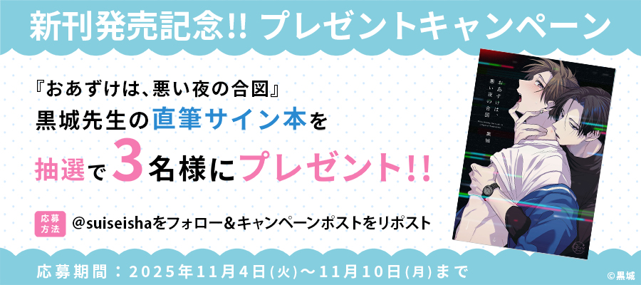 ▼応募期間2025年11月4日(火)~11月10日(月)23:59まで ▼応募方法期間中に彗星社の公式X(旧Twitter)のアカウントのフォローと対象ポストのリポストをそれぞれ行ってください。 ▼プレゼント内容抽選で3名様に、黒城先生の直筆サイン入り「おあずけは、悪い夜の合図」単行本 ▼注意事項・キャンペーンは予告なく変更、中止することがあります。あらかじめご了承ください。・X(旧Twitter)の操作方法などに関するご質問にはお答えしかねます。ご了承ください。・当選者には当アカウントからDMにておしらせしますので、DMの解放をお願いします。・当選者へのご連絡が終わるまで、当アカウントへのフォローとリポストはそのままでお願いします。・当選した賞品の権利の譲渡はできません。また、賞品当選確定後のキャンセルはできかねます。・当選の発表は賞品の発送をもってかえさせていただきます。なお、賞品は2025年12月上旬頃までに発送予定です。・賞品の発送は日本国内に限らせていただきます。・当選の可否に関するお問い合わせにはお答えできません。 ・複数のX(旧Twitter)アカウントを使用して重複当選したことが判明した場合、応募を無効とさせていただきます。・本キャンペーンと同月中の他のキャンペーン賞品に重複して当選することはできません。・ご応募いただいた個人情報は賞品をお届けするために利用し、その他の目的では使用しません。ただし転売が発覚した場合のみ、調査のために使用する場合がございます。・本キャンペーン賞品の転売または譲渡は一切禁止させていただいております。転売サイト、SNS等での売買をされませんようお願いいたします。 ・お客様の故意または故意でない場合のいずれの場合においても、X(旧Twitter)に個人情報が流出しないよう、ご注意ください。・第三者がお客様の書き込み内容を利用したことによって受けた損害や、お客様が受けた損害については、一切の保証をいたしません。