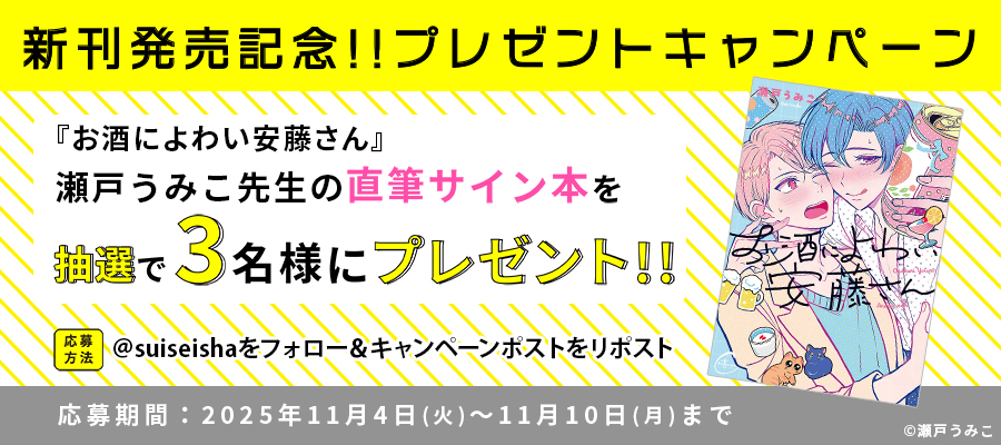 ▼応募期間2025年11月4日(火)~11月10日(月)23:59まで ▼応募方法期間中に彗星社の公式X(旧Twitter)のアカウントのフォローと対象ポストのリポストをそれぞれ行ってください。 ▼プレゼント内容抽選で3名様に、瀬戸うみこ先生の直筆サイン入り「お酒によわい安藤さん」単行本 ▼注意事項・キャンペーンは予告なく変更、中止することがあります。あらかじめご了承ください。・X(旧Twitter)の操作方法などに関するご質問にはお答えしかねます。ご了承ください。・当選者には当アカウントからDMにておしらせしますので、DMの解放をお願いします。・当選者へのご連絡が終わるまで、当アカウントへのフォローとリポストはそのままでお願いします。・当選した賞品の権利の譲渡はできません。また、賞品当選確定後のキャンセルはできかねます。・当選の発表は賞品の発送をもってかえさせていただきます。なお、賞品は2025年12月上旬頃までに発送予定です。・賞品の発送は日本国内に限らせていただきます。・当選の可否に関するお問い合わせにはお答えできません。 ・複数のX(旧Twitter)アカウントを使用して重複当選したことが判明した場合、応募を無効とさせていただきます。・本キャンペーンと同月中の他のキャンペーン賞品に重複して当選することはできません。・ご応募いただいた個人情報は賞品をお届けするために利用し、その他の目的では使用しません。ただし転売が発覚した場合のみ、調査のために使用する場合がございます。・本キャンペーン賞品の転売または譲渡は一切禁止させていただいております。転売サイト、SNS等での売買をされませんようお願いいたします。 ・お客様の故意または故意でない場合のいずれの場合においても、X(旧Twitter)に個人情報が流出しないよう、ご注意ください。・第三者がお客様の書き込み内容を利用したことによって受けた損害や、お客様が受けた損害については、一切の保証をいたしません。