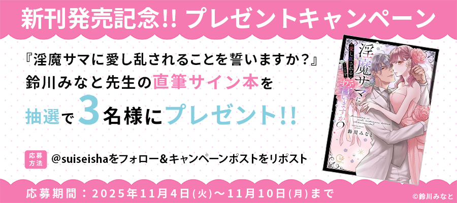 ▼応募期間2025年11月4日(火)~11月10日(月)23:59まで ▼応募方法期間中に彗星社の公式X(旧Twitter)のアカウントのフォローと対象ポストのリポストをそれぞれ行ってください。 ▼プレゼント内容抽選で3名様に、鈴川みなと先生の直筆サイン入り「淫魔サマに愛し乱されることを誓いますか?」単行本 ▼注意事項・キャンペーンは予告なく変更、中止することがあります。あらかじめご了承ください。・X(旧Twitter)の操作方法などに関するご質問にはお答えしかねます。ご了承ください。・当選者には当アカウントからDMにておしらせしますので、DMの解放をお願いします。・当選者へのご連絡が終わるまで、当アカウントへのフォローとリポストはそのままでお願いします。・当選した賞品の権利の譲渡はできません。また、賞品当選確定後のキャンセルはできかねます。・当選の発表は賞品の発送をもってかえさせていただきます。なお、賞品は2025年12月上旬頃までに発送予定です。・賞品の発送は日本国内に限らせていただきます。・当選の可否に関するお問い合わせにはお答えできません。 ・複数のX(旧Twitter)アカウントを使用して重複当選したことが判明した場合、応募を無効とさせていただきます。・本キャンペーンと同月中の他のキャンペーン賞品に重複して当選することはできません。・ご応募いただいた個人情報は賞品をお届けするために利用し、その他の目的では使用しません。ただし転売が発覚した場合のみ、調査のために使用する場合がございます。・本キャンペーン賞品の転売または譲渡は一切禁止させていただいております。転売サイト、SNS等での売買をされませんようお願いいたします。 ・お客様の故意または故意でない場合のいずれの場合においても、X(旧Twitter)に個人情報が流出しないよう、ご注意ください。・第三者がお客様の書き込み内容を利用したことによって受けた損害や、お客様が受けた損害については、一切の保証をいたしません。