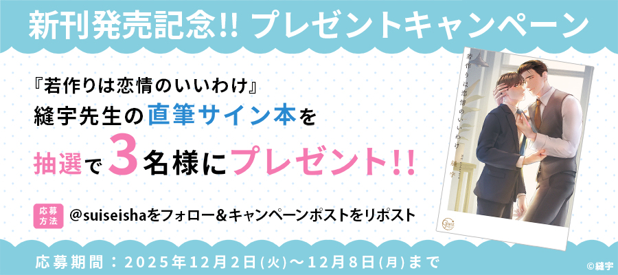 ▼応募期間2025年12月2日(火)~12月8日(月)23:59まで ▼応募方法期間中に彗星社の公式X(旧Twitter)のアカウントのフォローと対象ポストのリポストをそれぞれ行ってください。 ▼プレゼント内容抽選で3名様に、縫宇先生の直筆サイン入り「若作りは恋情のいいわけ」単行本 ▼注意事項・キャンペーンは予告なく変更、中止することがあります。あらかじめご了承ください。・X(旧Twitter)の操作方法などに関するご質問にはお答えしかねます。ご了承ください。・当選者には当アカウントからDMにておしらせしますので、DMの解放をお願いします。・当選者へのご連絡が終わるまで、当アカウントへのフォローとリポストはそのままでお願いします。・当選した賞品の権利の譲渡はできません。また、賞品当選確定後のキャンセルはできかねます。・当選の発表は賞品の発送をもってかえさせていただきます。なお、賞品は2026年1月中旬頃までに発送予定です。・賞品の発送は日本国内に限らせていただきます。・当選の可否に関するお問い合わせにはお答えできません。 ・複数のX(旧Twitter)アカウントを使用して重複当選したことが判明した場合、応募を無効とさせていただきます。・本キャンペーンと同月中の他のキャンペーン賞品に重複して当選することはできません。・ご応募いただいた個人情報は賞品をお届けするために利用し、その他の目的では使用しません。ただし転売が発覚した場合のみ、調査のために使用する場合がございます。・本キャンペーン賞品の転売または譲渡は一切禁止させていただいております。転売サイト、SNS等での売買をされませんようお願いいたします。 ・お客様の故意または故意でない場合のいずれの場合においても、X(旧Twitter)に個人情報が流出しないよう、ご注意ください。・第三者がお客様の書き込み内容を利用したことによって受けた損害や、お客様が受けた損害については、一切の保証をいたしません。