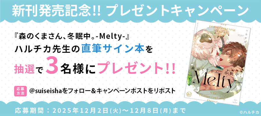 ▼応募期間2025年12月2日(火)~12月8日(月)23:59まで ▼応募方法期間中に彗星社の公式X(旧Twitter)のアカウントのフォローと対象ポストのリポストをそれぞれ行ってください。 ▼プレゼント内容抽選で3名様に、ハルチカ先生の直筆サイン入り「森のくまさん、冬眠中。-Melty-」単行本 ▼注意事項・キャンペーンは予告なく変更、中止することがあります。あらかじめご了承ください。・X(旧Twitter)の操作方法などに関するご質問にはお答えしかねます。ご了承ください。・当選者には当アカウントからDMにておしらせしますので、DMの解放をお願いします。・当選者へのご連絡が終わるまで、当アカウントへのフォローとリポストはそのままでお願いします。・当選した賞品の権利の譲渡はできません。また、賞品当選確定後のキャンセルはできかねます。・当選の発表は賞品の発送をもってかえさせていただきます。なお、賞品は2026年1月中旬頃までに発送予定です。・賞品の発送は日本国内に限らせていただきます。・当選の可否に関するお問い合わせにはお答えできません。 ・複数のX(旧Twitter)アカウントを使用して重複当選したことが判明した場合、応募を無効とさせていただきます。・本キャンペーンと同月中の他のキャンペーン賞品に重複して当選することはできません。・ご応募いただいた個人情報は賞品をお届けするために利用し、その他の目的では使用しません。ただし転売が発覚した場合のみ、調査のために使用する場合がございます。・本キャンペーン賞品の転売または譲渡は一切禁止させていただいております。転売サイト、SNS等での売買をされませんようお願いいたします。 ・お客様の故意または故意でない場合のいずれの場合においても、X(旧Twitter)に個人情報が流出しないよう、ご注意ください。・第三者がお客様の書き込み内容を利用したことによって受けた損害や、お客様が受けた損害については、一切の保証をいたしません。