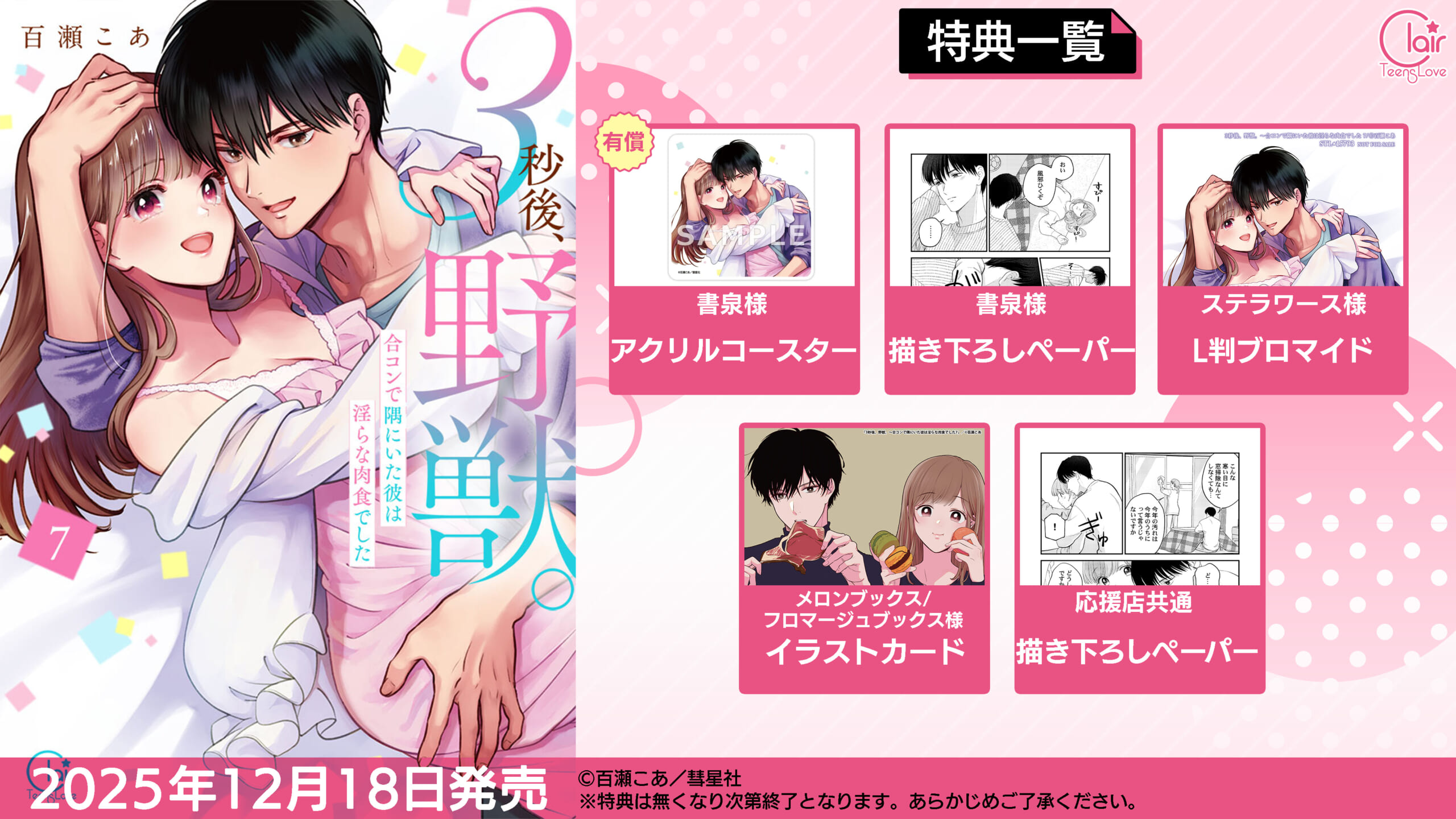2025年12月18日発売「3秒後、野獣。~合コンで隅にいた彼は淫らな肉食でした7」の各法人様限定の購入特典の配布が決定いたしました!こちらでドドンとご紹介です! 特典情報 ・書泉限定 描き下ろしペーパー ・ステラワース限定 L判ブロマイド ・メロンブックス/フロマージュブックス限定 イラストカード ・共通 描き下ろしペーパー ※こちらの応援店にて配布 有償特典情報 ・書泉限定 アクリルコースター