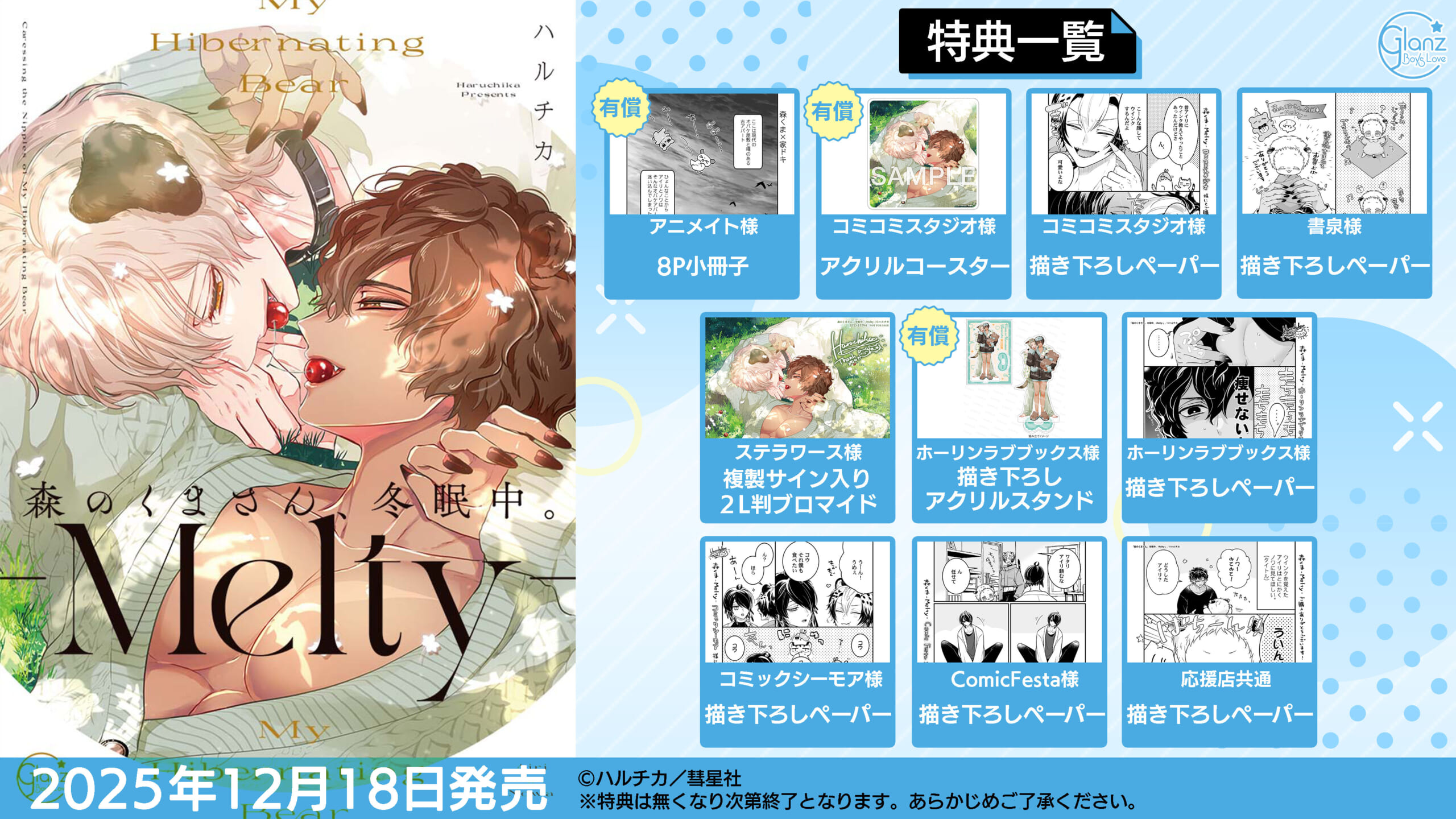 2025年12月18日発売「森のくまさん、冬眠中。-Melty-」の各法人様限定の購入特典の配布が決定いたしました!こちらでドドンとご紹介です! 特典情報 ・コミコミスタジオ限定 描き下ろしペーパー ・書泉限定 描き下ろしペーパー ・ステラワース限定 複製サイン入り2L判ブロマイド ・ホーリンラブブックス限定 描き下ろしペーパー ・コミックシーモア限定 描き下ろしペーパー ・ComicFesta限定 描き下ろしペーパー ・共通 描き下ろしペーパー ※こちらの応援店にて配布 有償特典情報 ・アニメイト限定 8P小冊子・コミコミスタジオ限定 アクリルコースター・ホーリンラブブックス限定 描き下ろしアクリルスタンド