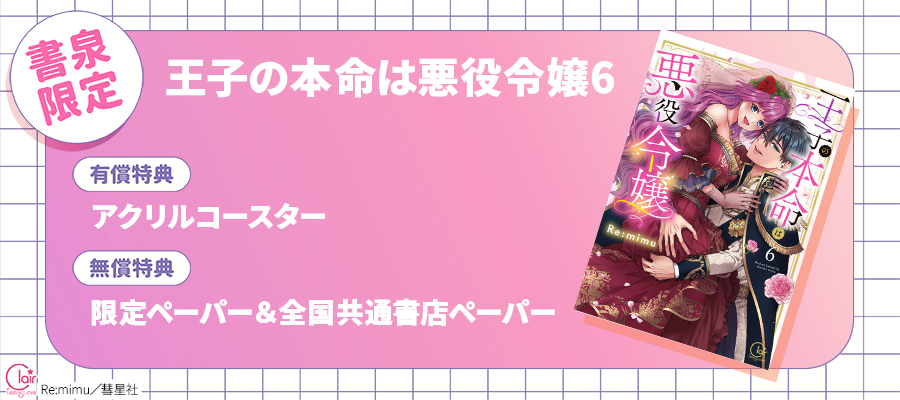 2026年2月18日発売「王子の本命は悪役令嬢6」が、書泉限定の有償特典として「アクリルコースター」付きのセット販売が決定しました! ▼予約販売スケジュール予約販売開始:2025年12月23日(月)販売場所:書泉 ▼セット内容【有償特典付き】王子の本命は悪役令嬢6・新刊「王子の本命は悪役令嬢6」1冊・有償特典:アクリルコースター1点・無償特典:書泉限定ペーパー&全国共通ペーパー 販売ページはコチラ
