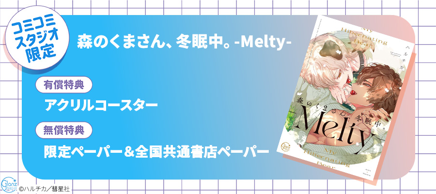 2025年12月18日発売「森のくまさん、冬眠中。-Melty-」が、コミコミスタジオ限定の有償特典として「アクリルコースター」付きのセット販売が決定しました! ▼予約販売スケジュール予約販売開始:2025年10月24日(金)販売場所:コミコミスタジオ ▼セット内容【有償特典付き】森のくまさん、冬眠中。-Melty-・新刊「森のくまさん、冬眠中。-Melty-」1冊・有償特典:アクリルコースター1点・無償特典:コミコミスタジオ限定ペーパー&全国共通ペーパー 販売ページはコチラ