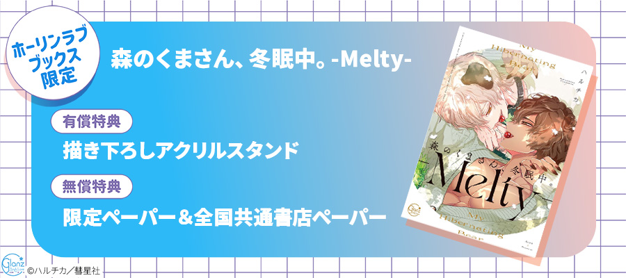 2025年12月18日発売「森のくまさん、冬眠中。-Melty-」が、ホーリンラブブックス限定の有償特典として「描き下ろしアクリルスタンド」付きのセット販売が決定しました! ▼予約販売スケジュール予約販売開始:2025年10月24日(金)販売場所:ホーリンラブブックス ▼セット内容【有償特典付き】森のくまさん、冬眠中。-Melty-・新刊「森のくまさん、冬眠中。-Melty-」1冊・有償特典:描き下ろしアクリルスタンド・無償特典:ホーリンラブブックス限定ペーパー&全国共通ペーパー 販売ページはコチラ