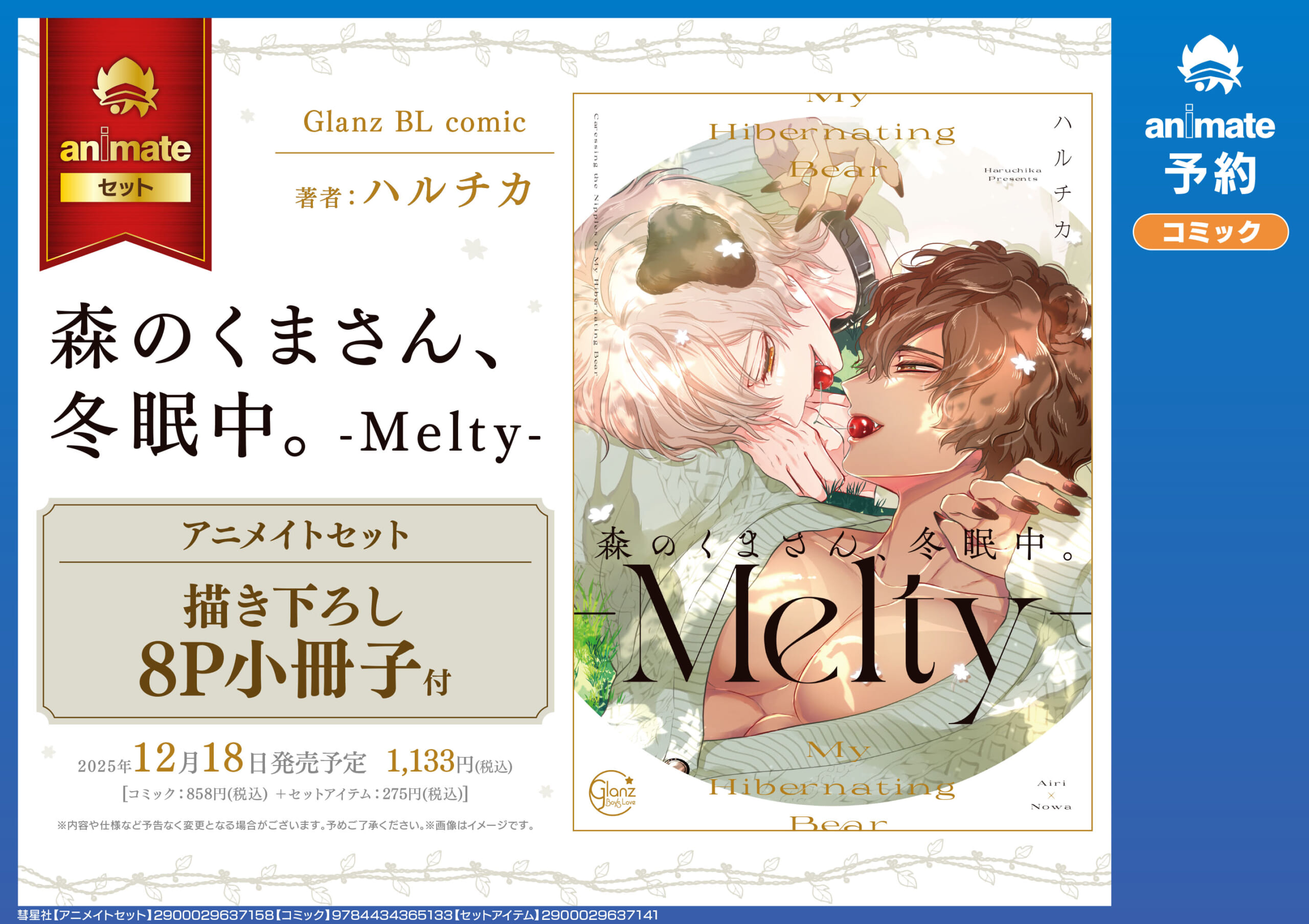 2025年12月18日発売「森のくまさん、冬眠中。-Melty-」で、アニメイト限定の有償特典として「描き下ろし8P小冊子」付きのセット販売が決定しました! ▼セット内容 ・新刊「森のくまさん、冬眠中。-Melty-」1冊 858円(税込)セットアイテム:描き下ろし8P小冊子 275円(税込) ▼詳細はアニメイトさまの販売ページをご確認ください森のくまさん、冬眠中。-Melty-アニメイト限定セット【描き下ろし入り8P小冊子付き】