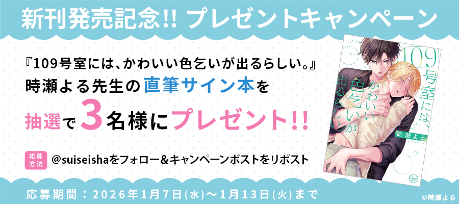 ▼応募期間2026年1月7日(水)~1月13日(火)23:59まで ▼応募方法期間中に彗星社の公式X(旧Twitter)のアカウントのフォローと対象ポストのリポストをそれぞれ行ってください。 ▼プレゼント内容抽選で3名様に、時瀬よる先生の直筆サイン入り「109号室には、かわいい色乞いが出るらしい。」単行本 ▼注意事項・キャンペーンは予告なく変更、中止することがあります。あらかじめご了承ください。・X(旧Twitter)の操作方法などに関するご質問にはお答えしかねます。ご了承ください。・当選者には当アカウントからDMにておしらせしますので、DMの解放をお願いします。・当選者へのご連絡が終わるまで、当アカウントへのフォローとリポストはそのままでお願いします。・当選した賞品の権利の譲渡はできません。また、賞品当選確定後のキャンセルはできかねます。・当選の発表は賞品の発送をもってかえさせていただきます。なお、賞品は2026年2月中旬頃までに発送予定です。・賞品の発送は日本国内に限らせていただきます。・当選の可否に関するお問い合わせにはお答えできません。 ・複数のX(旧Twitter)アカウントを使用して重複当選したことが判明した場合、応募を無効とさせていただきます。・本キャンペーンと同月中の他のキャンペーン賞品に重複して当選することはできません。・ご応募いただいた個人情報は賞品をお届けするために利用し、その他の目的では使用しません。ただし転売が発覚した場合のみ、調査のために使用する場合がございます。・本キャンペーン賞品の転売または譲渡は一切禁止させていただいております。転売サイト、SNS等での売買をされませんようお願いいたします。 ・お客様の故意または故意でない場合のいずれの場合においても、X(旧Twitter)に個人情報が流出しないよう、ご注意ください。・第三者がお客様の書き込み内容を利用したことによって受けた損害や、お客様が受けた損害については、一切の保証をいたしません。