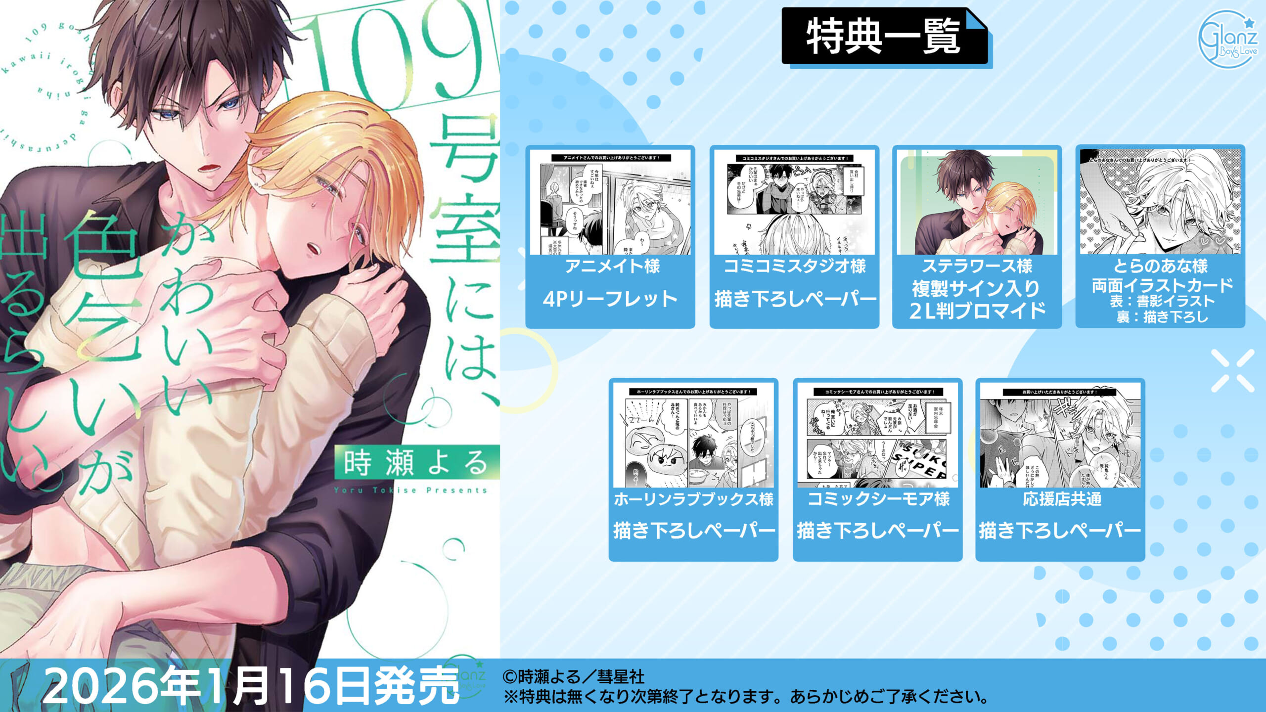 2026年1月16日発売「109号室には、かわいい色乞いが出るらしい。」の各法人様限定の購入特典の配布が決定いたしました!こちらでドドンとご紹介です! 特典情報 ・アニメイト限定 4Pリーフレット ・コミコミスタジオ限定 描き下ろしペーパー ・ステラワース限定 複製サイン入り2L判ブロマイド ・とらのあな限定 両面イラストカード ・ホーリンラブブックス限定 描き下ろしペーパー ・コミックシーモア限定 描き下ろしペーパー ・共通 描き下ろしペーパー ※こちらの応援店にて配布