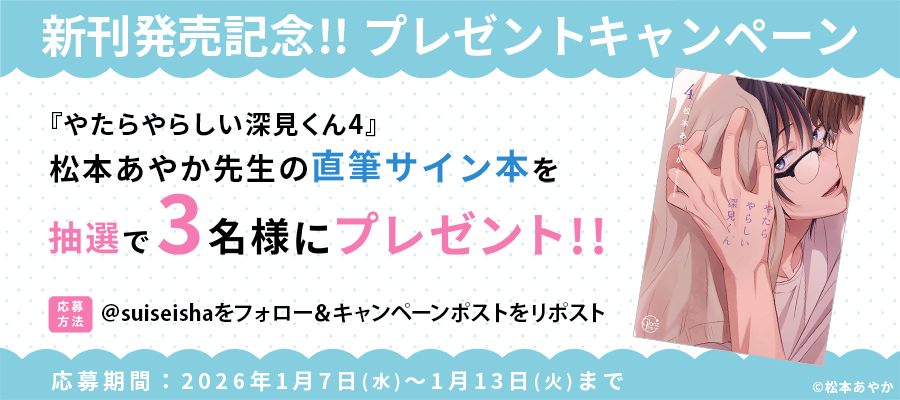 ▼応募期間2026年1月7日(水)~1月13日(火)23:59まで ▼応募方法期間中に彗星社の公式X(旧Twitter)のアカウントのフォローと対象ポストのリポストをそれぞれ行ってください。 ▼プレゼント内容抽選で3名様に、松本あやか先生の直筆サイン入り「やたらやらしい深見くん4」単行本 ▼注意事項・キャンペーンは予告なく変更、中止することがあります。あらかじめご了承ください。・X(旧Twitter)の操作方法などに関するご質問にはお答えしかねます。ご了承ください。・当選者には当アカウントからDMにておしらせしますので、DMの解放をお願いします。・当選者へのご連絡が終わるまで、当アカウントへのフォローとリポストはそのままでお願いします。・当選した賞品の権利の譲渡はできません。また、賞品当選確定後のキャンセルはできかねます。・当選の発表は賞品の発送をもってかえさせていただきます。なお、賞品は2026年2月中旬頃までに発送予定です。・賞品の発送は日本国内に限らせていただきます。・当選の可否に関するお問い合わせにはお答えできません。 ・複数のX(旧Twitter)アカウントを使用して重複当選したことが判明した場合、応募を無効とさせていただきます。・本キャンペーンと同月中の他のキャンペーン賞品に重複して当選することはできません。・ご応募いただいた個人情報は賞品をお届けするために利用し、その他の目的では使用しません。ただし転売が発覚した場合のみ、調査のために使用する場合がございます。・本キャンペーン賞品の転売または譲渡は一切禁止させていただいております。転売サイト、SNS等での売買をされませんようお願いいたします。 ・お客様の故意または故意でない場合のいずれの場合においても、X(旧Twitter)に個人情報が流出しないよう、ご注意ください。・第三者がお客様の書き込み内容を利用したことによって受けた損害や、お客様が受けた損害については、一切の保証をいたしません。