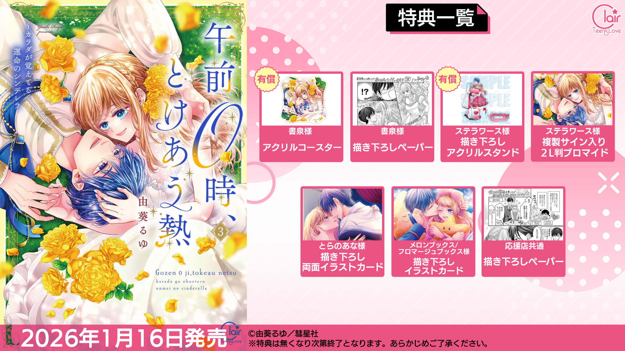 2026年1月16日発売「午前0時、とけあう熱~カラダが覚えてる運命のシンデレラ3」の各法人様限定の購入特典の配布が決定いたしました!こちらでドドンとご紹介です! 特典情報 ・書泉限定 描き下ろしペーパー ・ステラワース限定 複製サイン入り2L判ブロマイド ・とらのあな限定 描き下ろし両面イラストカード ・メロンブックス/フロマージュブックス限定 描き下ろしイラストカード ・共通 描き下ろしペーパー ※こちらの応援店にて配布 有償特典情報 ・書泉限定 アクリルコースター・ステラワース限定 描き下ろしアクリルスタンド