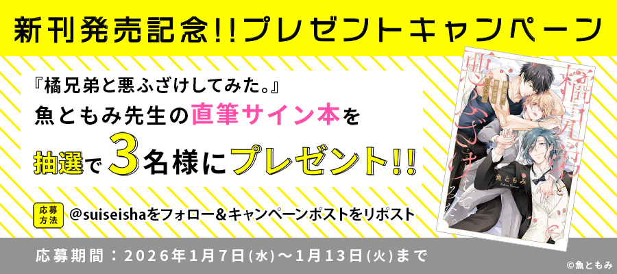 ▼応募期間2026年1月7日(水)~1月13日(火)23:59まで ▼応募方法期間中に彗星社の公式X(旧Twitter)のアカウントのフォローと対象ポストのリポストをそれぞれ行ってください。 ▼プレゼント内容抽選で3名様に、魚ともみ先生の直筆サイン入り「橘兄弟と悪ふざけしてみた。」単行本 ▼注意事項・キャンペーンは予告なく変更、中止することがあります。あらかじめご了承ください。・X(旧Twitter)の操作方法などに関するご質問にはお答えしかねます。ご了承ください。・当選者には当アカウントからDMにておしらせしますので、DMの解放をお願いします。・当選者へのご連絡が終わるまで、当アカウントへのフォローとリポストはそのままでお願いします。・当選した賞品の権利の譲渡はできません。また、賞品当選確定後のキャンセルはできかねます。・当選の発表は賞品の発送をもってかえさせていただきます。なお、賞品は2026年2月中旬頃までに発送予定です。・賞品の発送は日本国内に限らせていただきます。・当選の可否に関するお問い合わせにはお答えできません。 ・複数のX(旧Twitter)アカウントを使用して重複当選したことが判明した場合、応募を無効とさせていただきます。・本キャンペーンと同月中の他のキャンペーン賞品に重複して当選することはできません。・ご応募いただいた個人情報は賞品をお届けするために利用し、その他の目的では使用しません。ただし転売が発覚した場合のみ、調査のために使用する場合がございます。・本キャンペーン賞品の転売または譲渡は一切禁止させていただいております。転売サイト、SNS等での売買をされませんようお願いいたします。 ・お客様の故意または故意でない場合のいずれの場合においても、X(旧Twitter)に個人情報が流出しないよう、ご注意ください。・第三者がお客様の書き込み内容を利用したことによって受けた損害や、お客様が受けた損害については、一切の保証をいたしません。