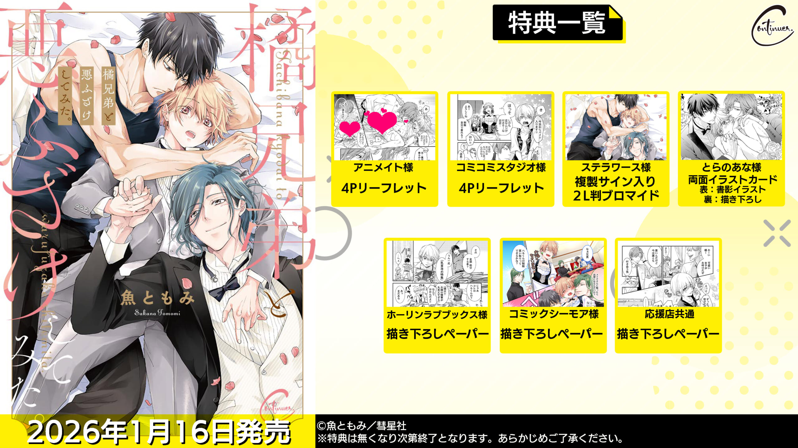 2026年1月16日発売「橘兄弟と悪ふざけしてみた。」の各法人様限定の購入特典の配布が決定いたしました!こちらでドドンとご紹介です! 特典情報 ・アニメイト限定 4Pリーフレット ・コミコミスタジオ限定 4Pリーフレット ・ステラワース限定 複製サイン入り2L判ブロマイド ・とらのあな限定 両面イラストカード ・ホーリンラブブックス限定 描き下ろしペーパー ・コミックシーモア限定 描き下ろしペーパー ・共通 描き下ろしペーパー ※こちらの応援店にて配布