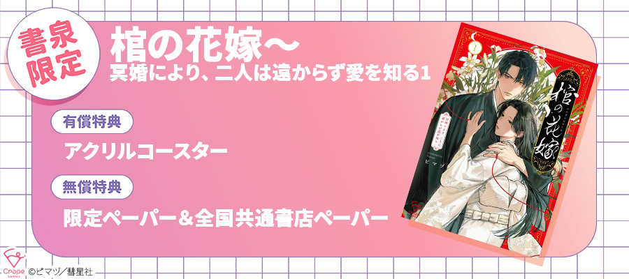 2026年5月18日発売「棺の花嫁~冥婚により、二人は遠からず愛を知る1」が、書泉限定の有償特典として「アクリルコースター」付きのセット販売が決定しました! ▼予約販売スケジュール予約販売開始:2026年4月10日(金)販売場所:書泉 ▼セット内容【有償特典付き】棺の花嫁~冥婚により、二人は遠からず愛を知る1・新刊「棺の花嫁~冥婚により、二人は遠からず愛を知る1」1冊・有償特典:アクリルコースター1点・無償特典:書泉限定ペーパー&全国共通ペーパー 販売ページはコチラ