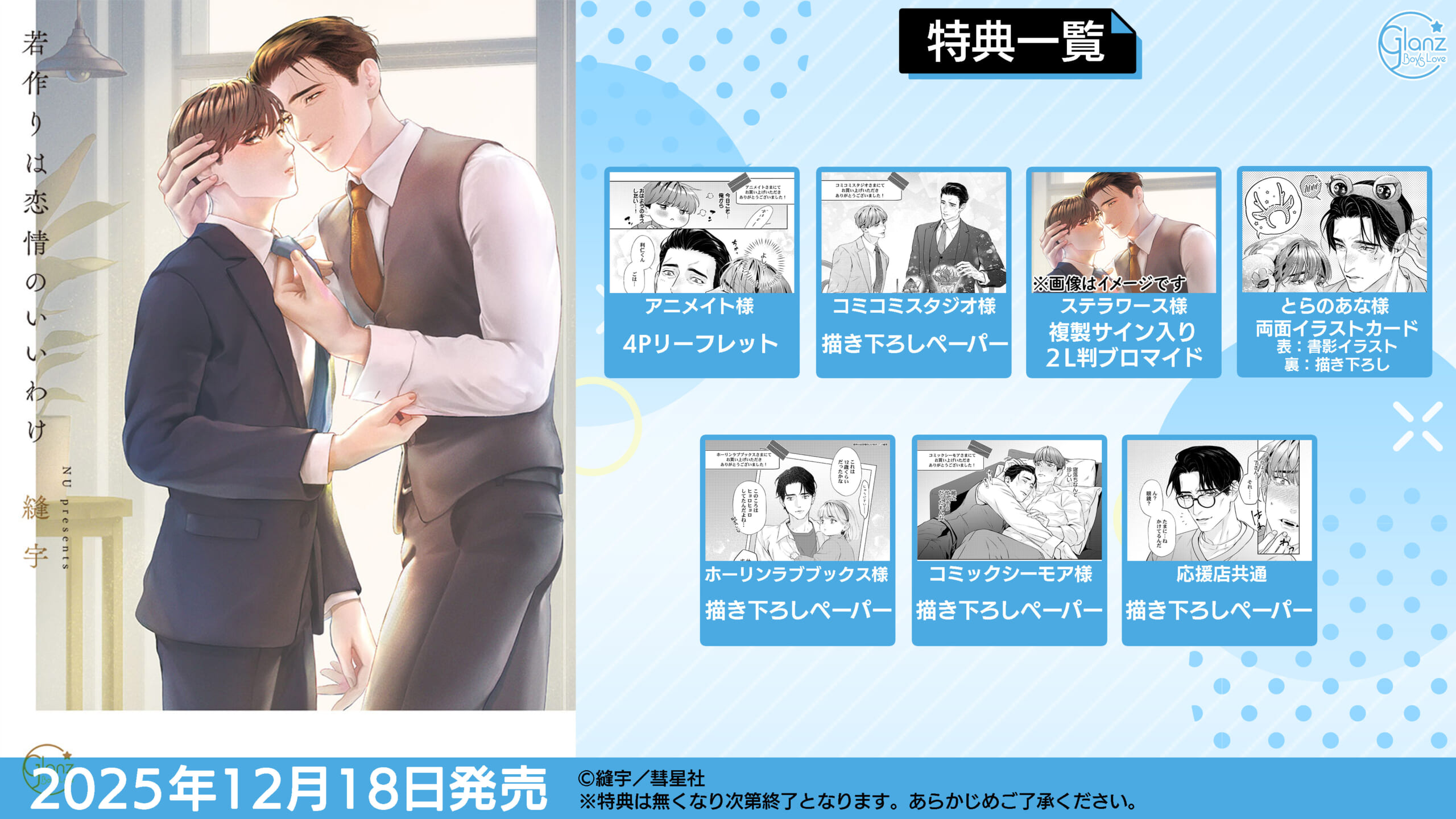 2025年12月18日発売「若作りは恋情のいいわけ」の各法人様限定の購入特典の配布が決定いたしました!こちらでドドンとご紹介です!