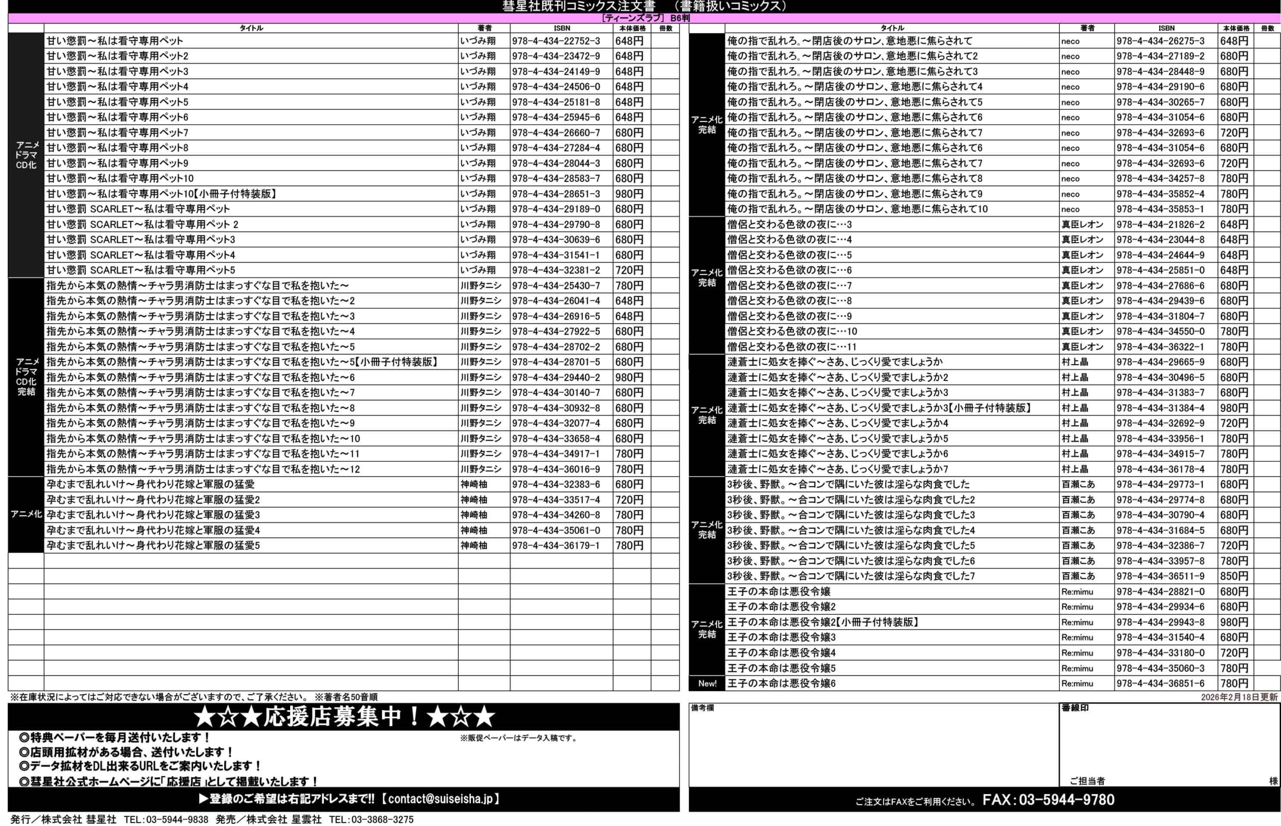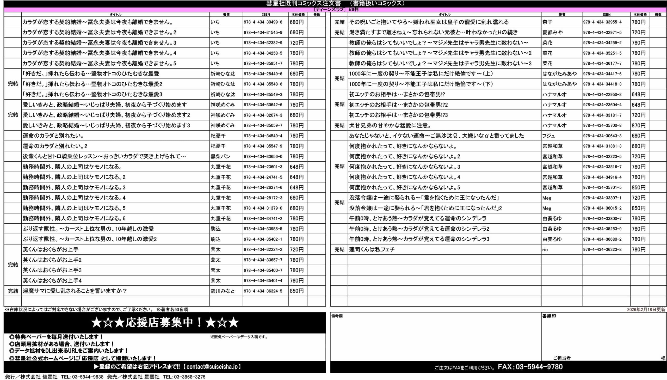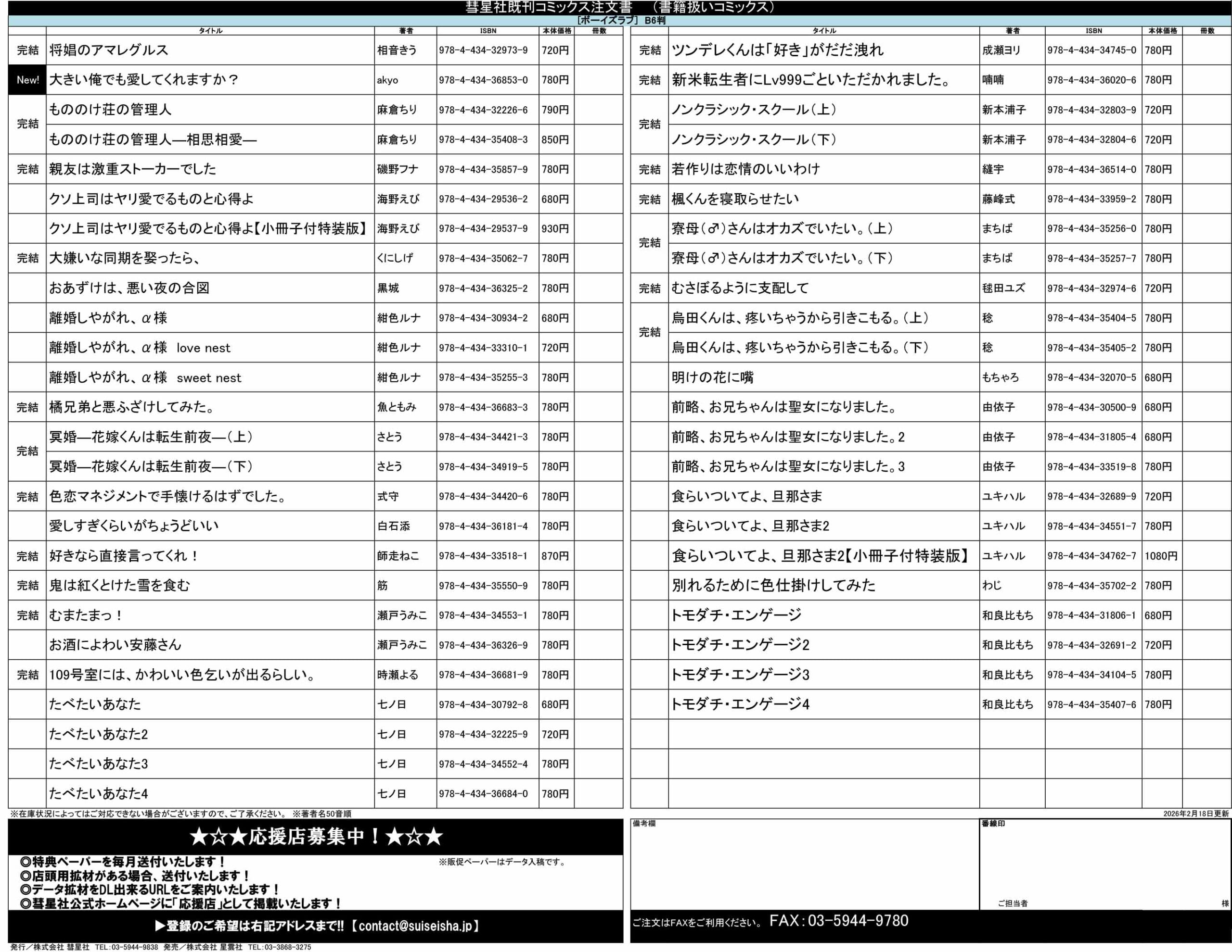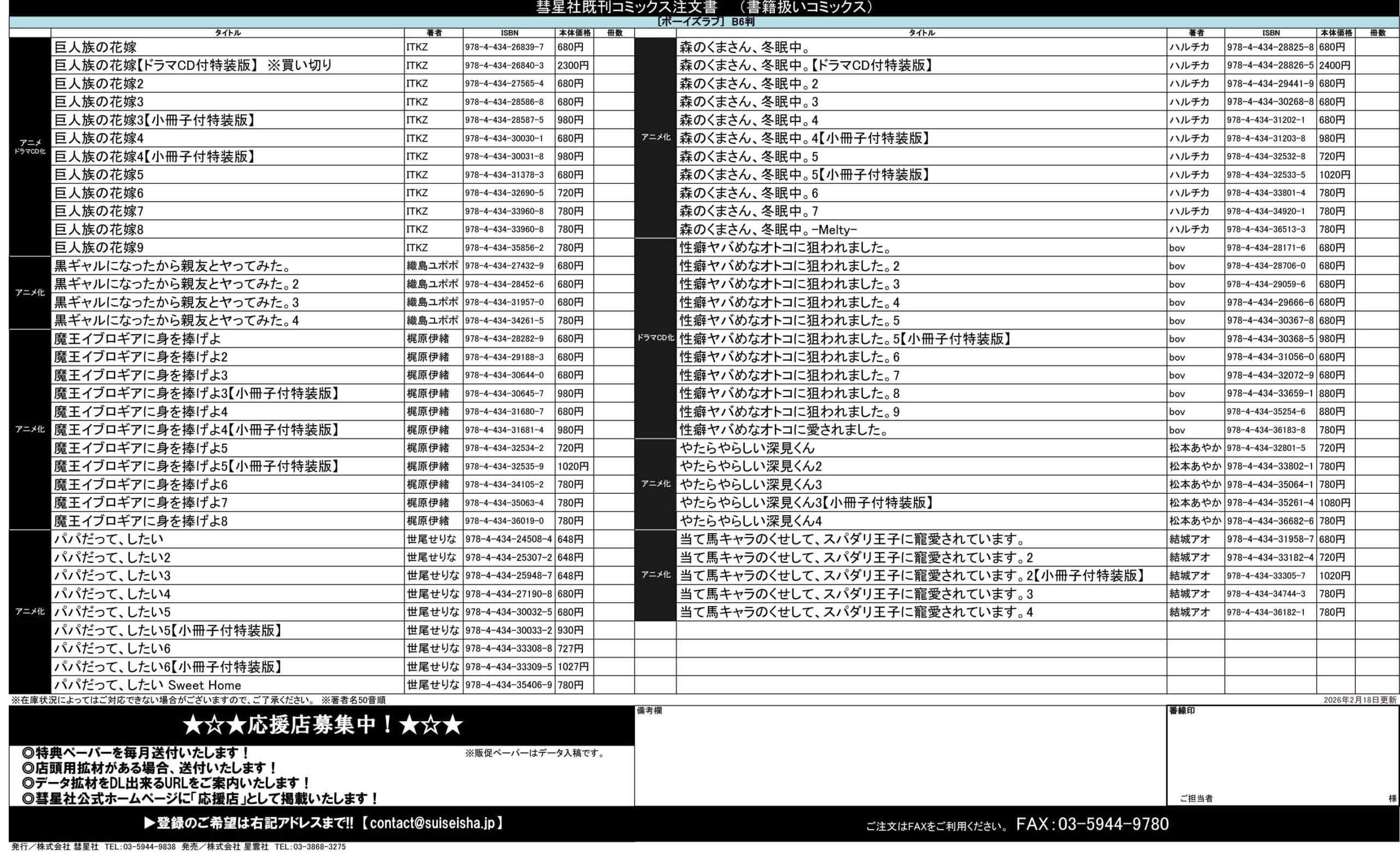 ◆コミックス注文書ダウンロード 2026/02/18更新