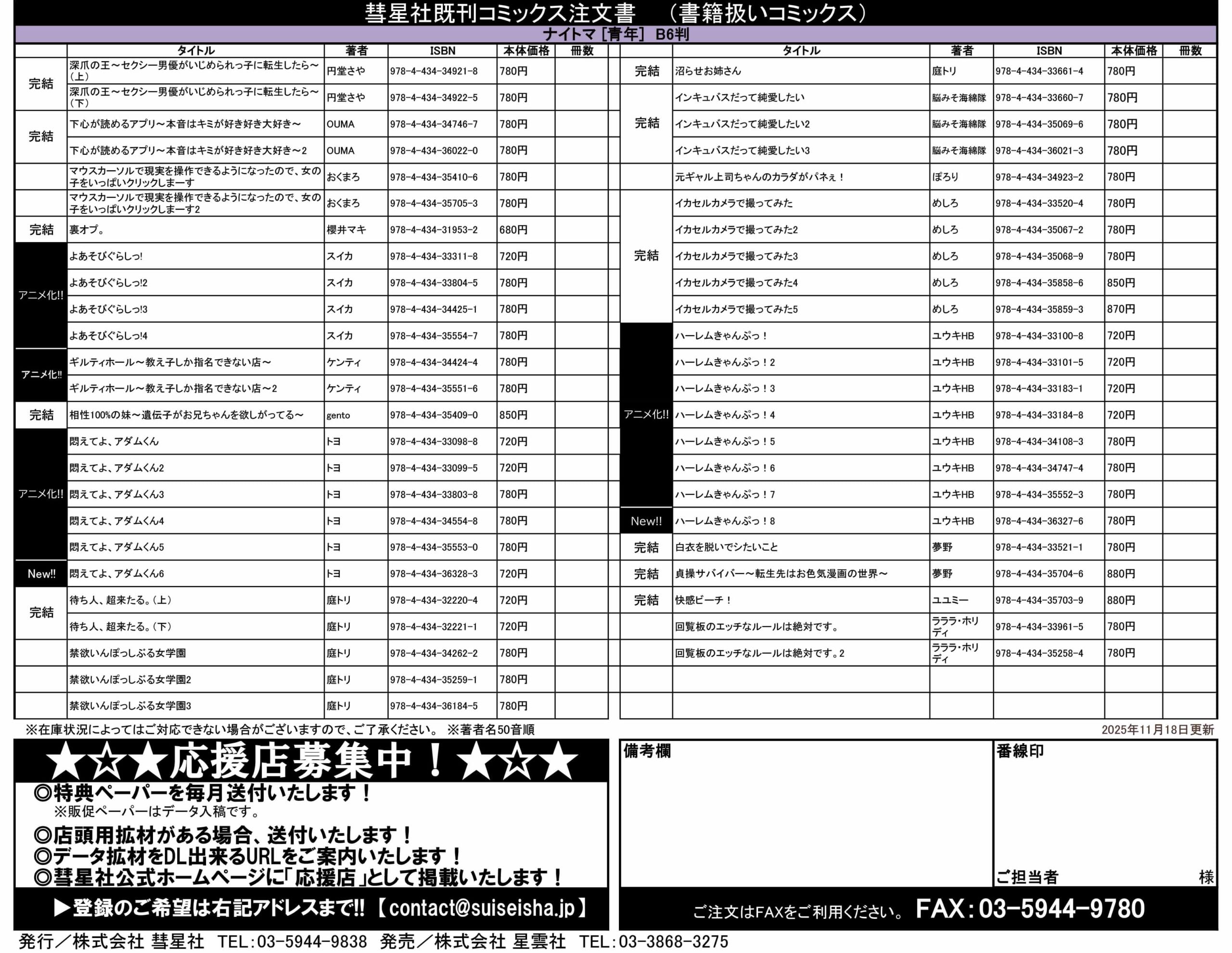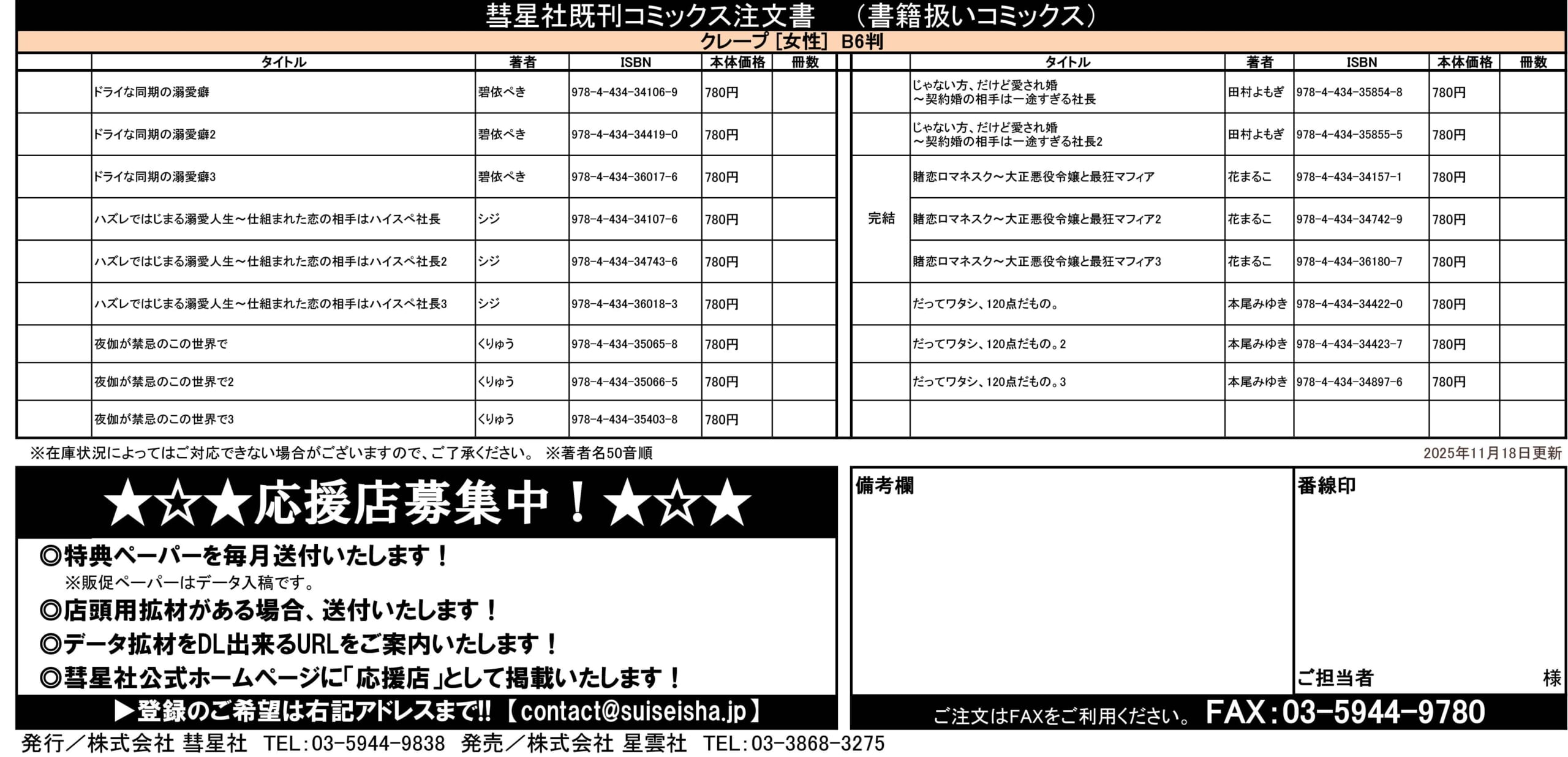 ◆コミックス注文書ダウンロード 2025年11月18日更新