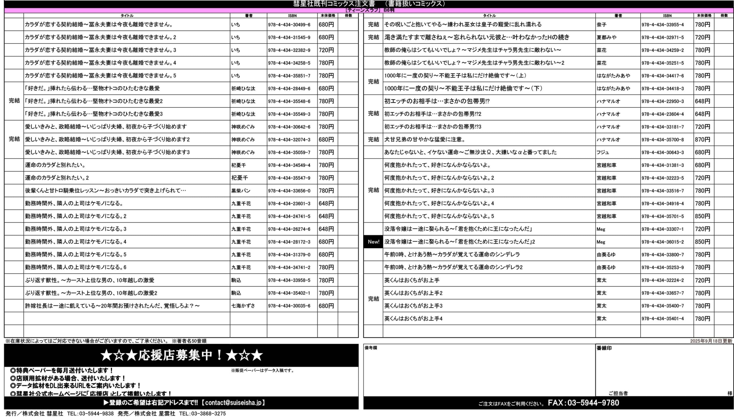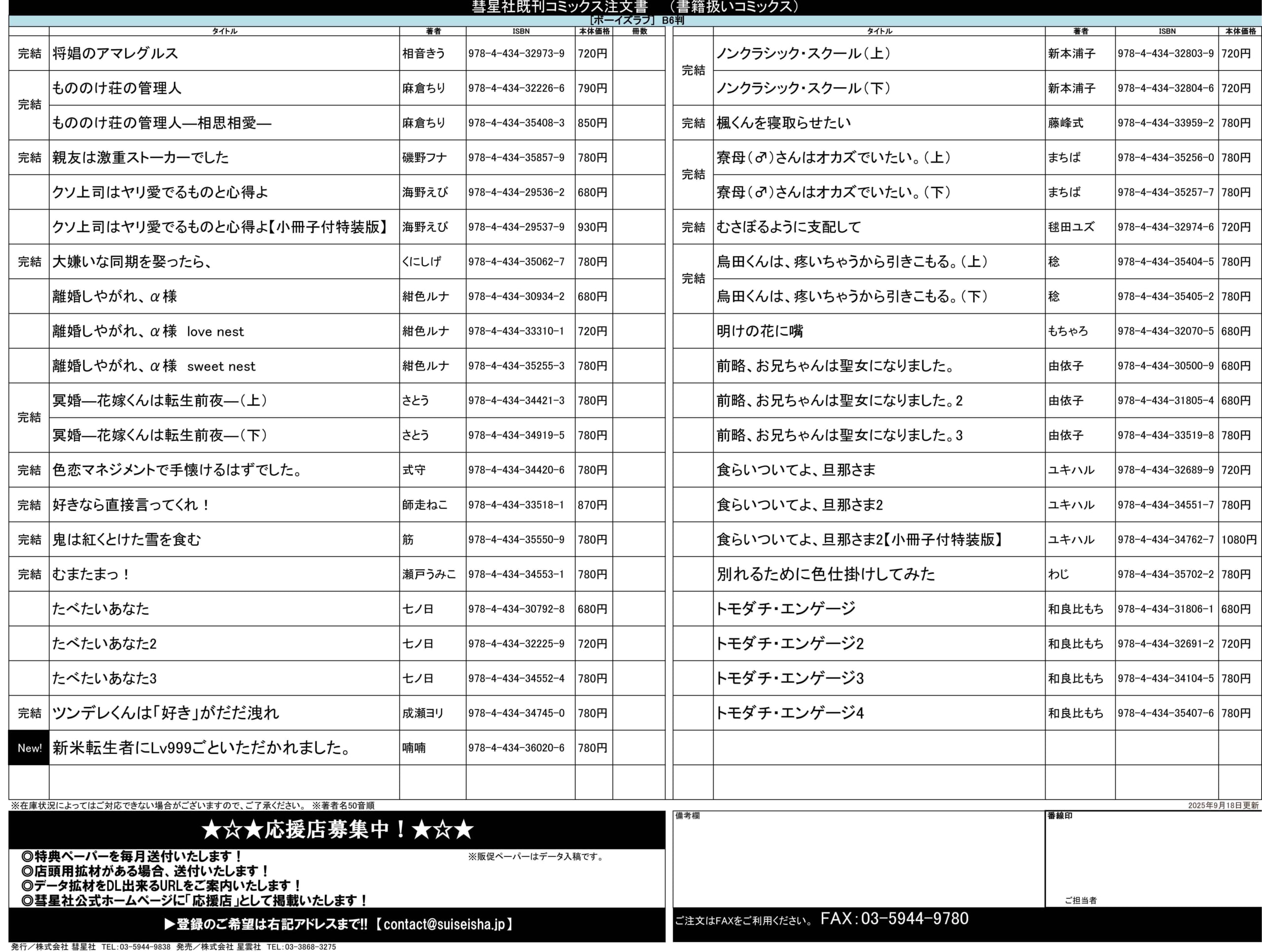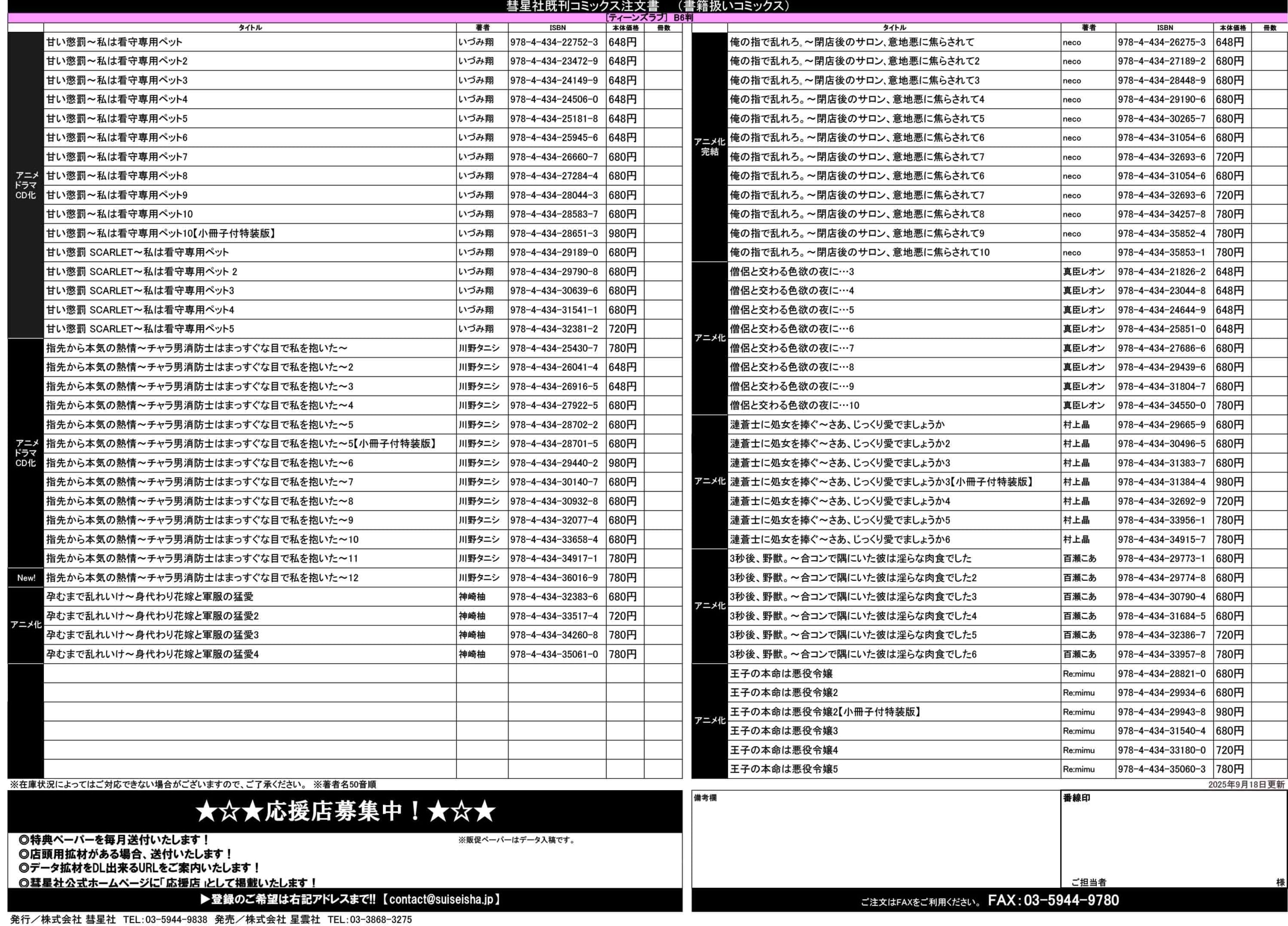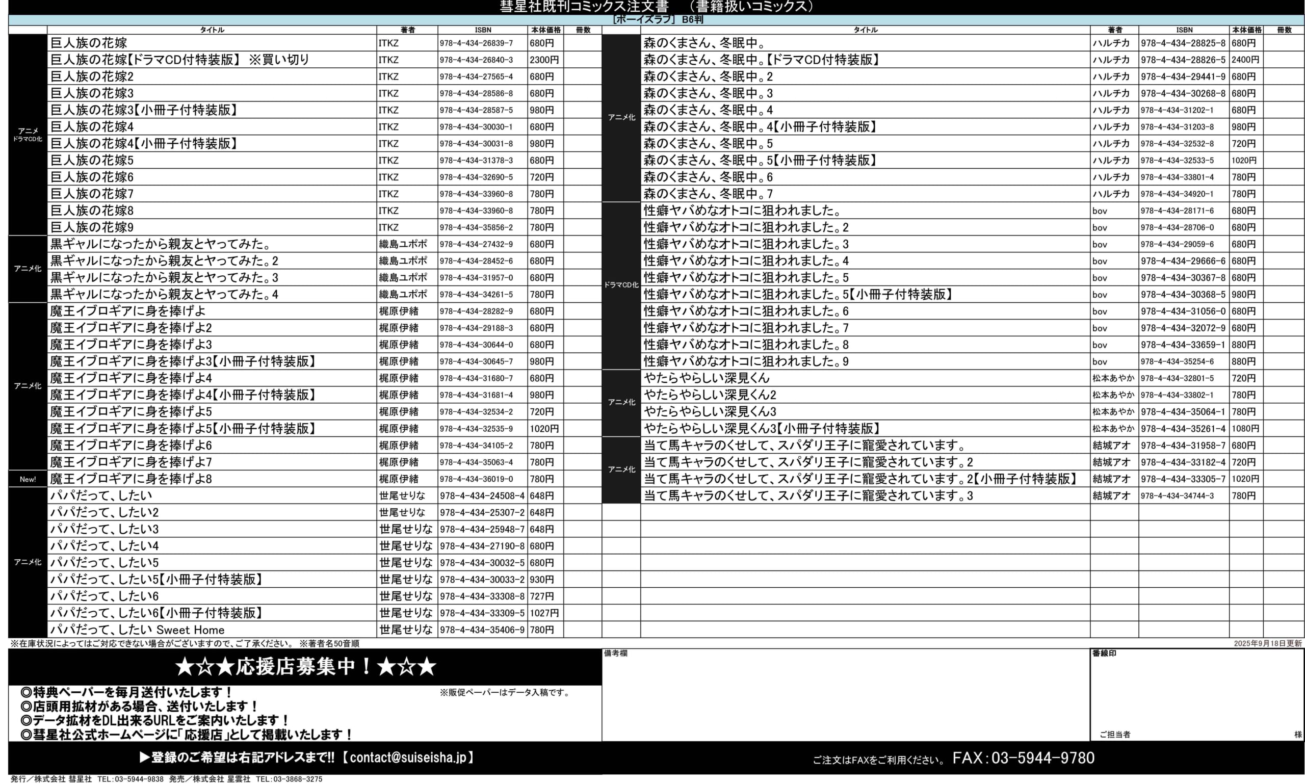 ◆コミックス注文書ダウンロード 2025/9/18更新